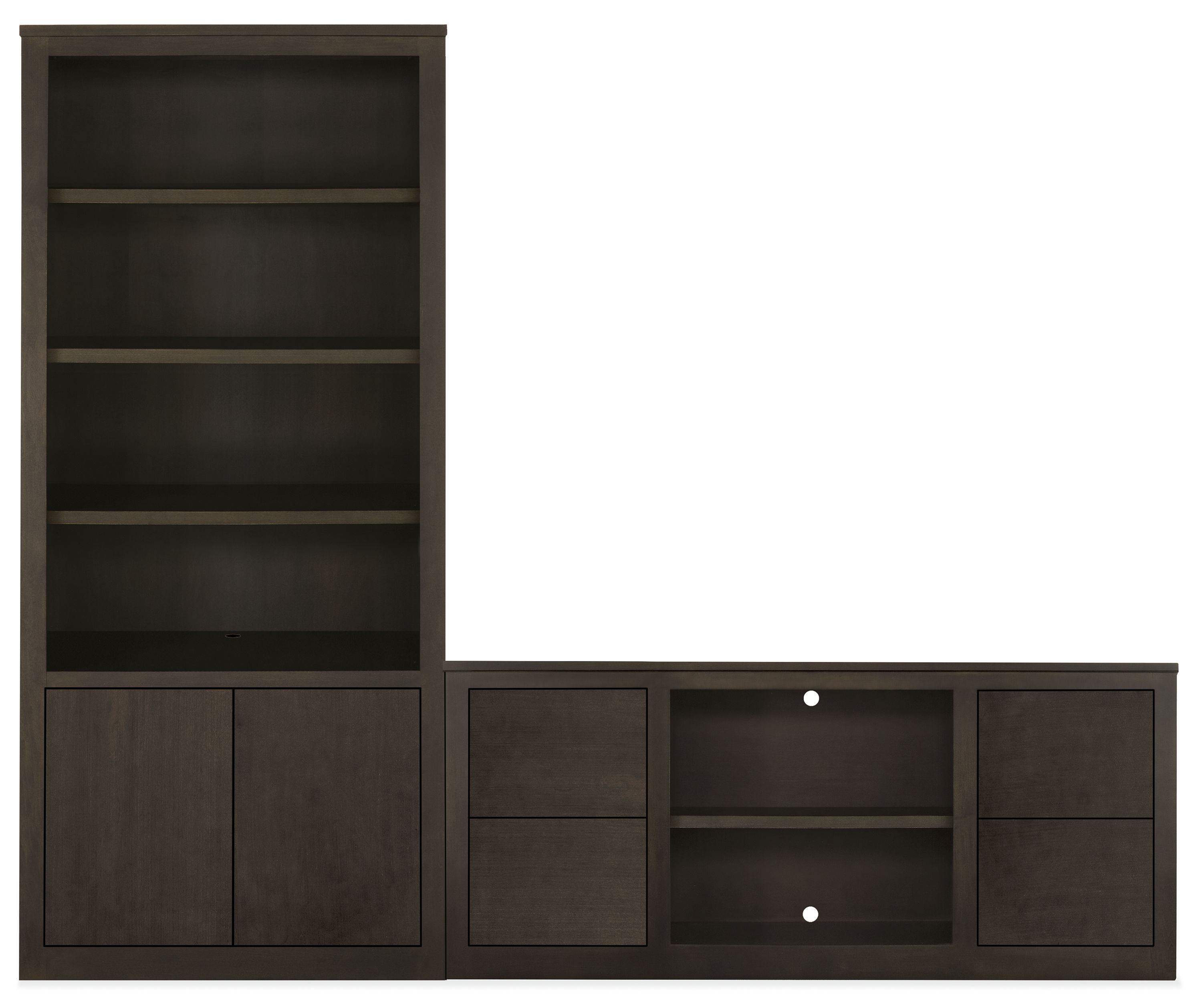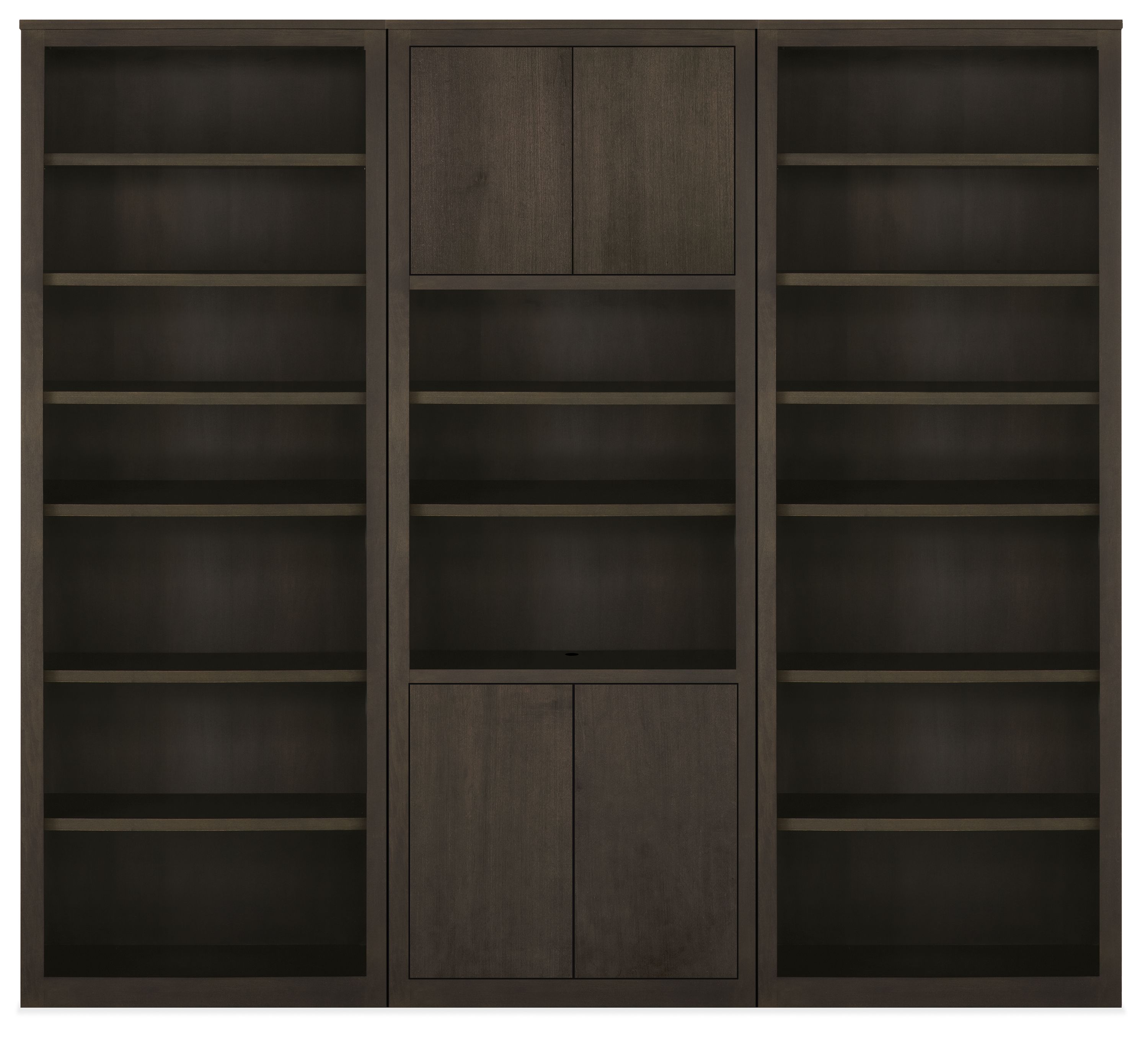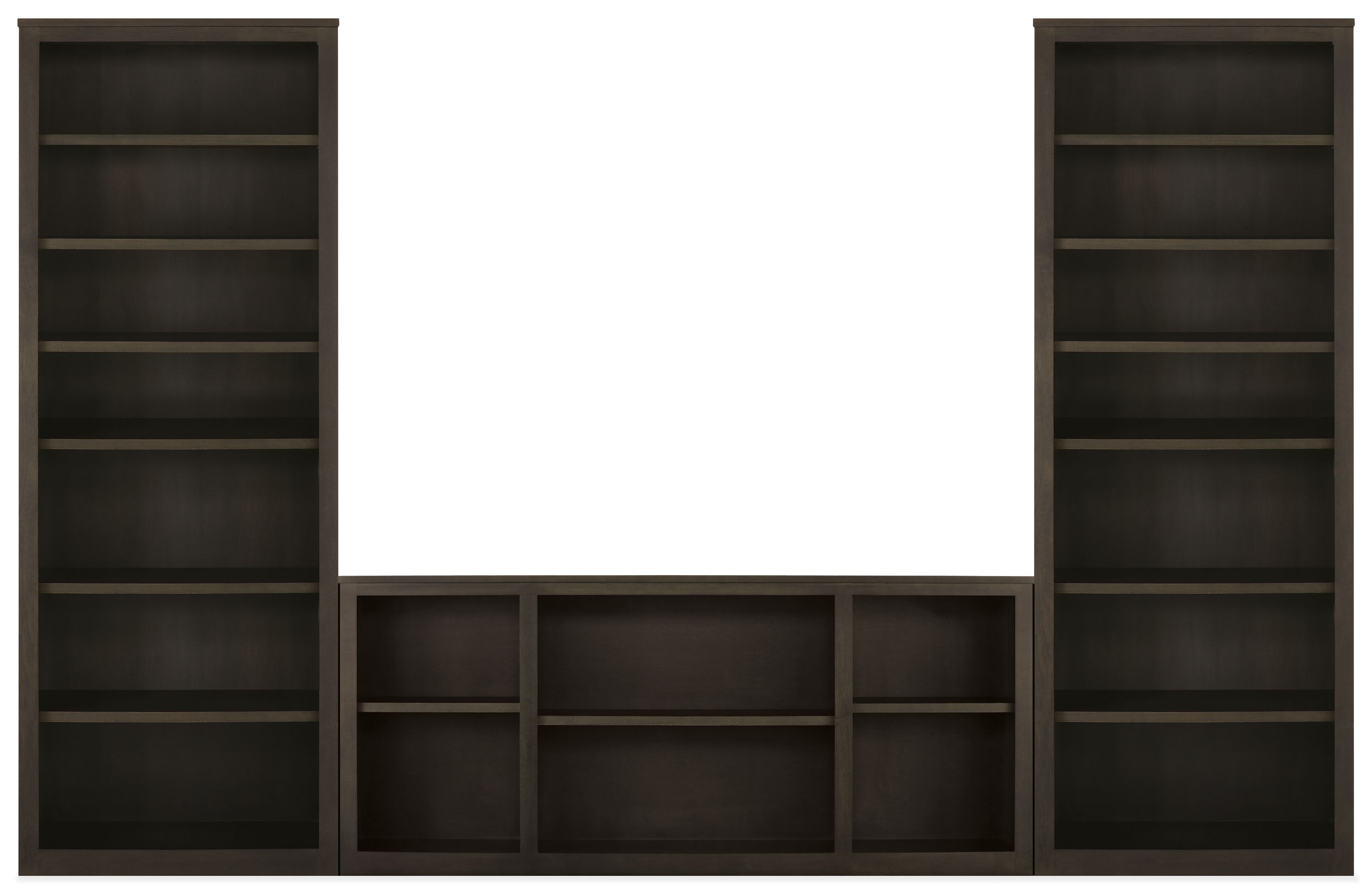 - Includes: (2) 32w 17d 86h two-door Bookcases; (1) 56w 17d 30h six-drawer Media Console; anti-tip safety hardware