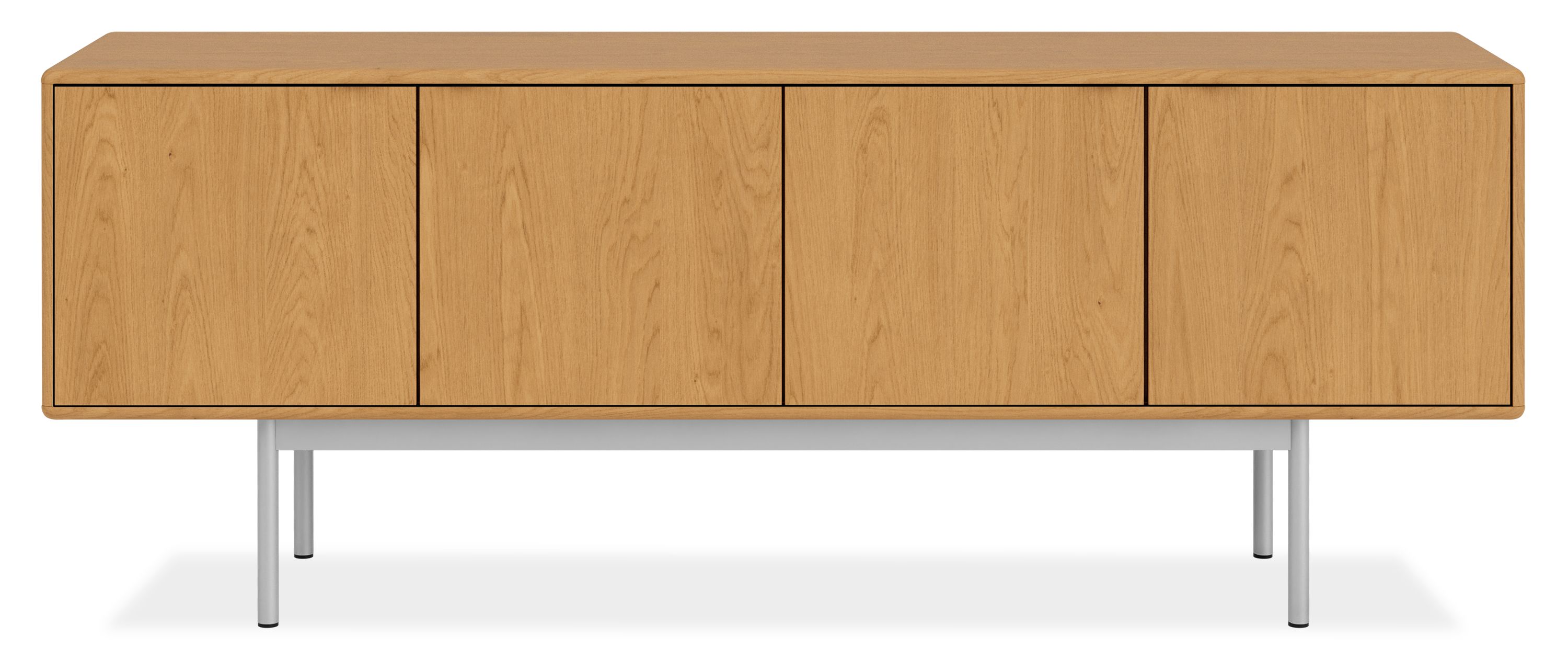 Our Hensley media cabinet brings a soft and modern silhouette to your home. Inspired by the timeless appeal of mid-century design and infused with modern details, Hensley features a stunning mix of materials that give it an updated look for today. You'll love the smooth feel of the domestically sourced solid wood, and appreciate the durability and beauty of the brushed stainless steel or powder-coated graphite base. Softly curved door pulls mimic the rounded edges of the media cabinet to round out this sophisticated storage option.