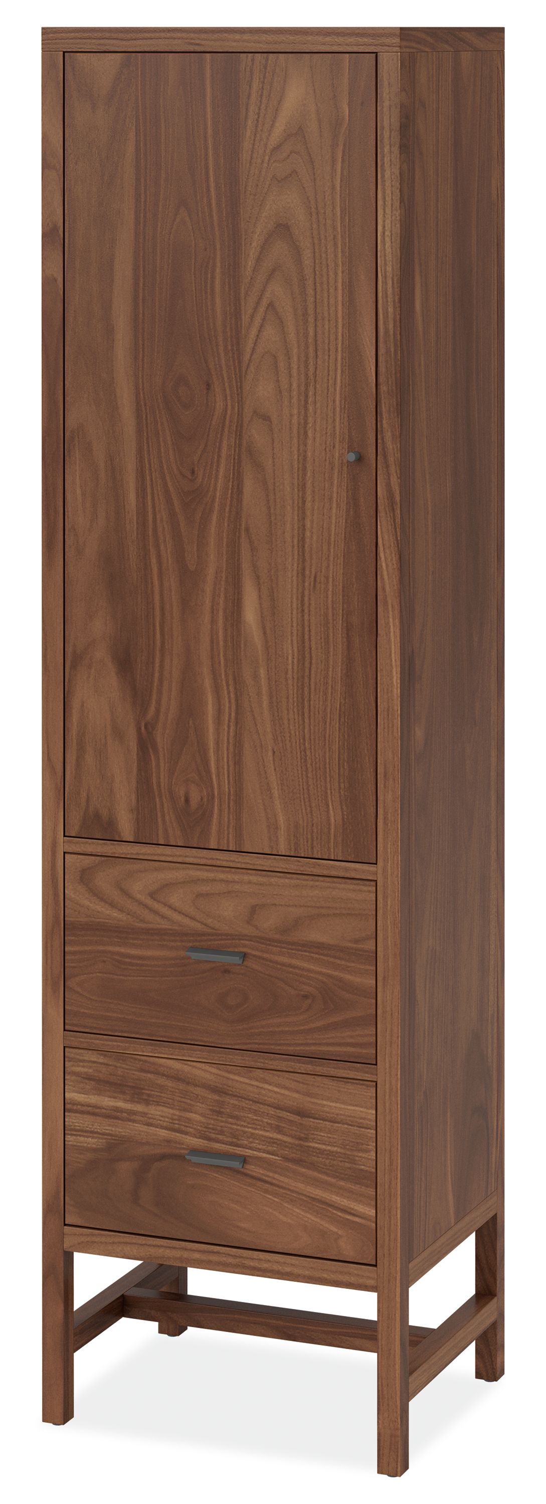A matching vanity and linen cabinet paired with a wood-framed wall mirror feature the elegance of walnut.