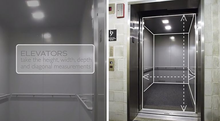 Measure the height and width of the elevator door and the interior height, width and depth. Also take the diagonal measurement from the bottom center of the door opening to the back ceiling. Be aware of handrails and overhead lights in the elevator and include them in your measurements.