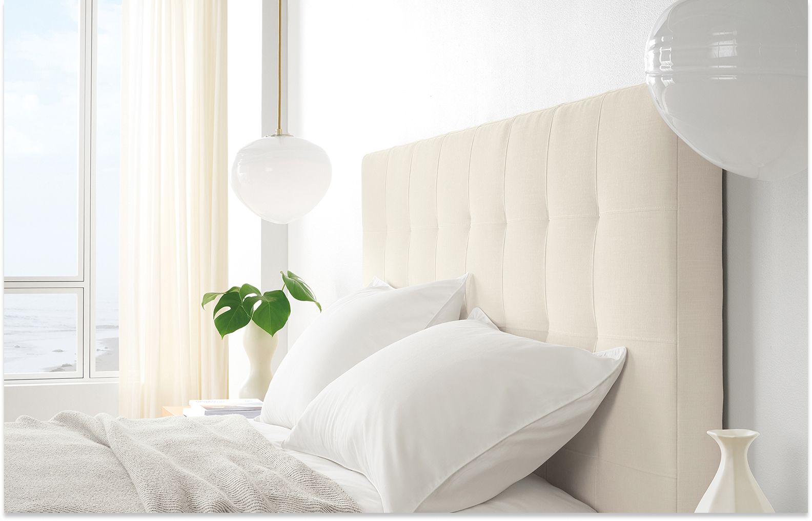- Save space and draw the eye upward by placing a small pendant or sconce above your nightstand.