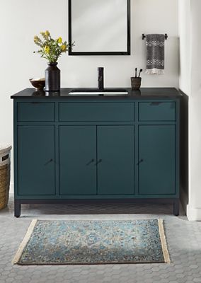 Rugs placed in front of a vanity provide color and warmth to a bathroom space.