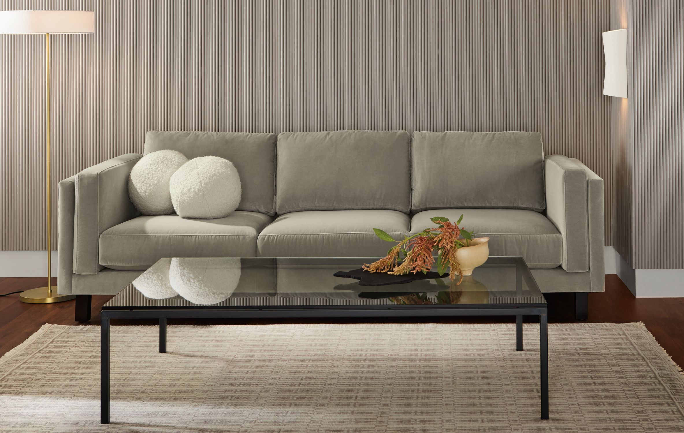Add interest by mixing in different textural elements. Try pairing a soft, nubby fabric with a smooth, hand-knotted, tight pile rug.