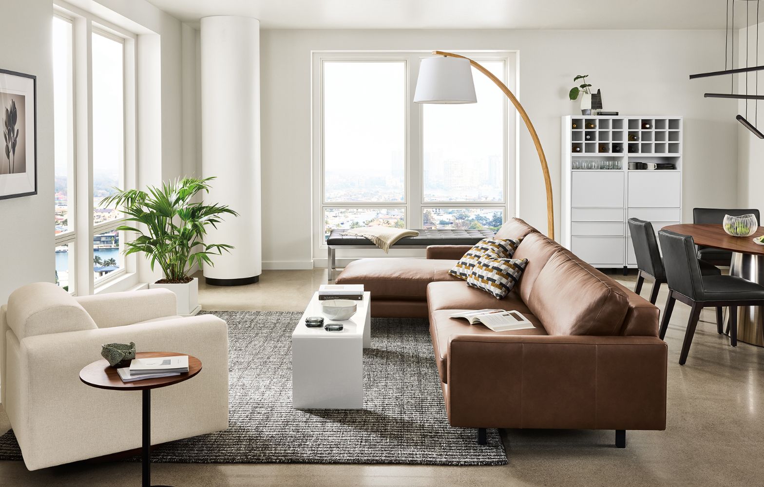 - A glass-topped coffee table provides an unobstructed view from living to dining space.