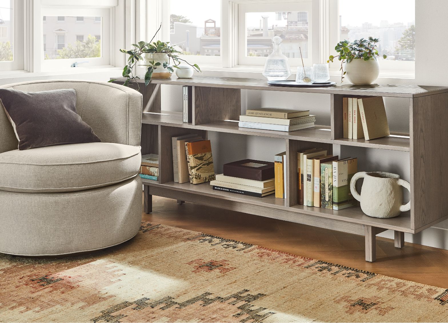 Overlooked spaces are perfect spots to sneak in storage. The low height allows this console bookcase to blend in without blocking the view.