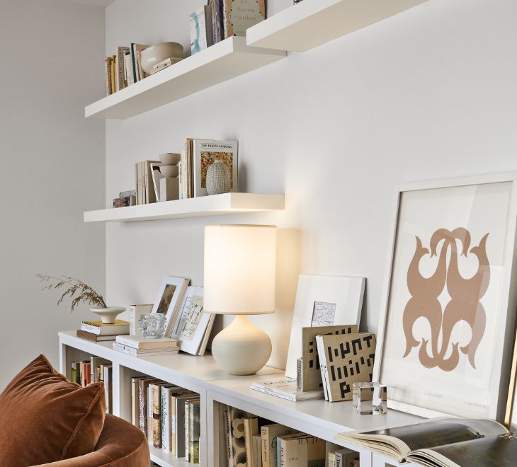Bookcase filling up? Add wall shelves to hold more of your favorites. Use horizontal space to display art and other items.