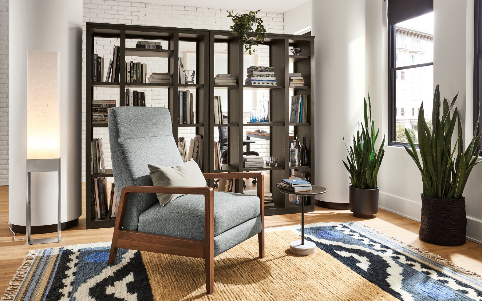 Use open back bookcases as room dividers and to create zones. Added bonus: Books and other items can be reached from either side.