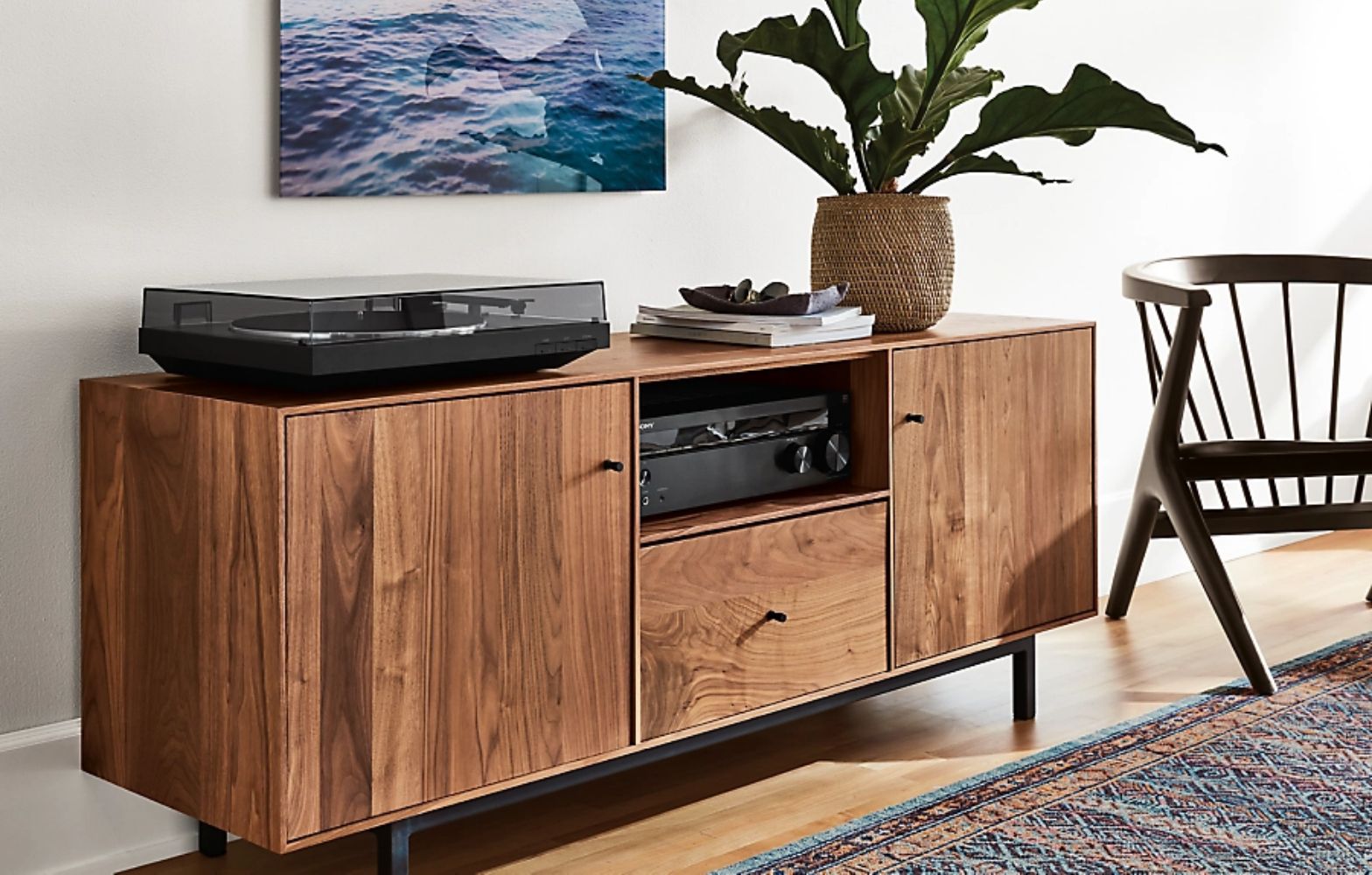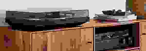 Give your record player the spotlight with an artisan-made cabinet. A single open shelf allows easy access to other components.