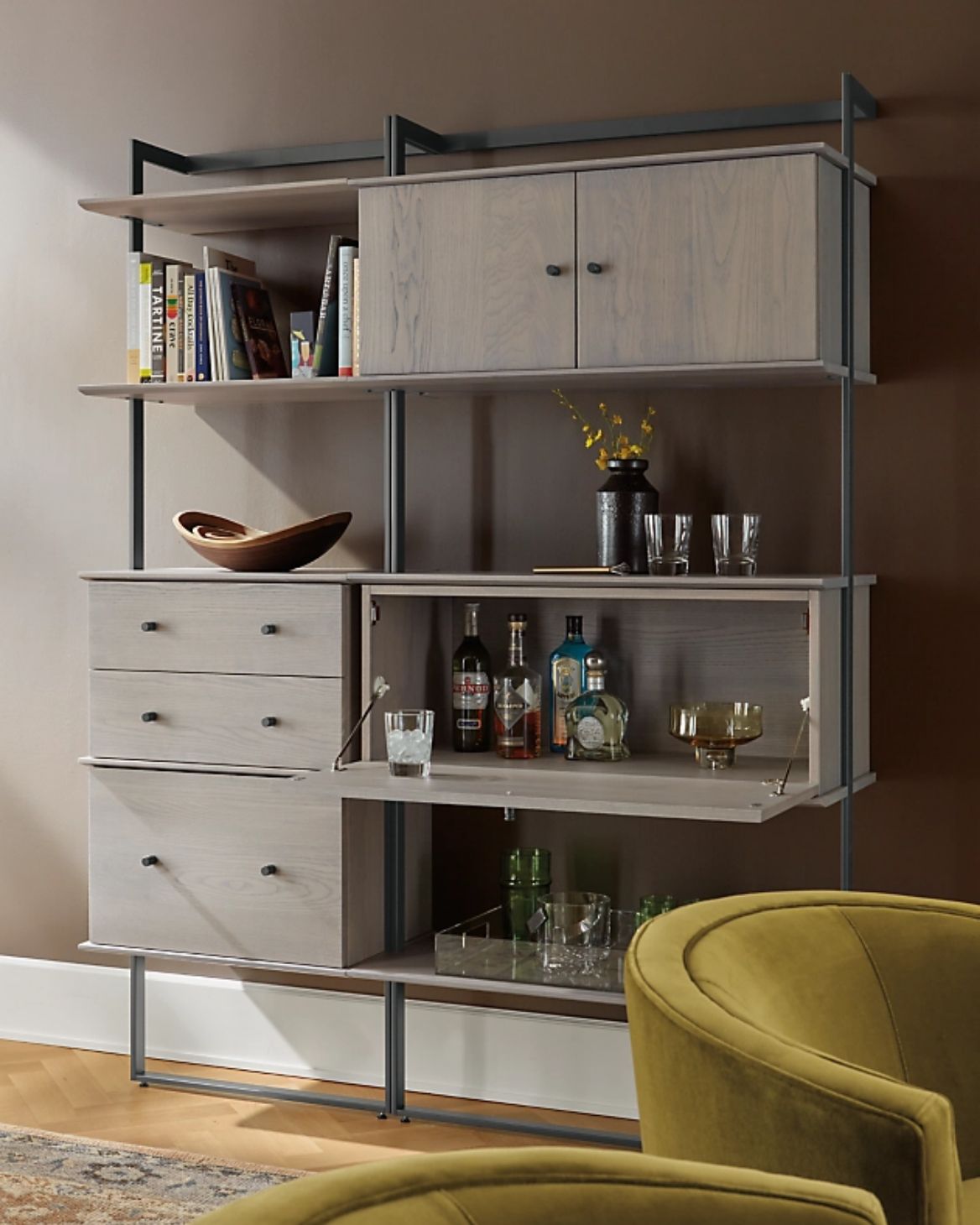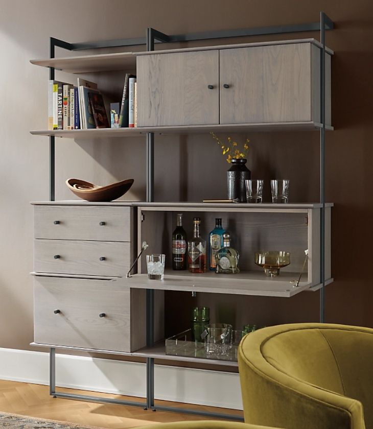 Configure a wall unit to your needs. This one-stop spot cleverly holds books, files and a drop-down surface for your bar.