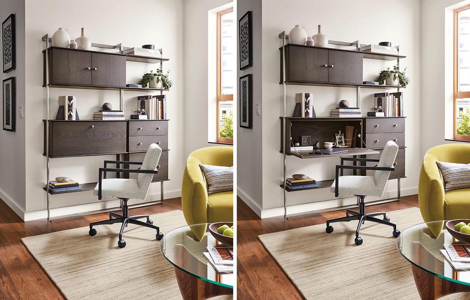 Create your ideal set-up with a modular design that makes the most of small spaces. A drop-down work surface lets you put the workday away.
