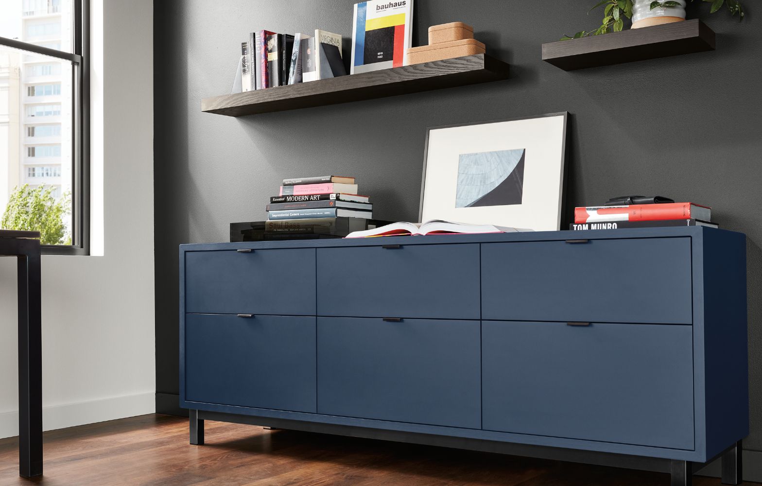 Modern file storage adds an eye-catching element to a living room. Large drawers store important papers and contain everyday clutter.