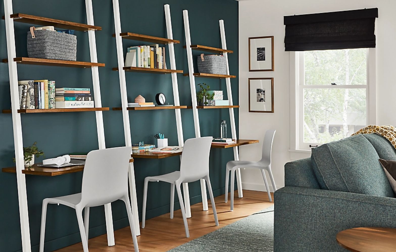 Desks with built-in shelves maximize wall space. Personalize each spot with favorite books, photos and office supplies.